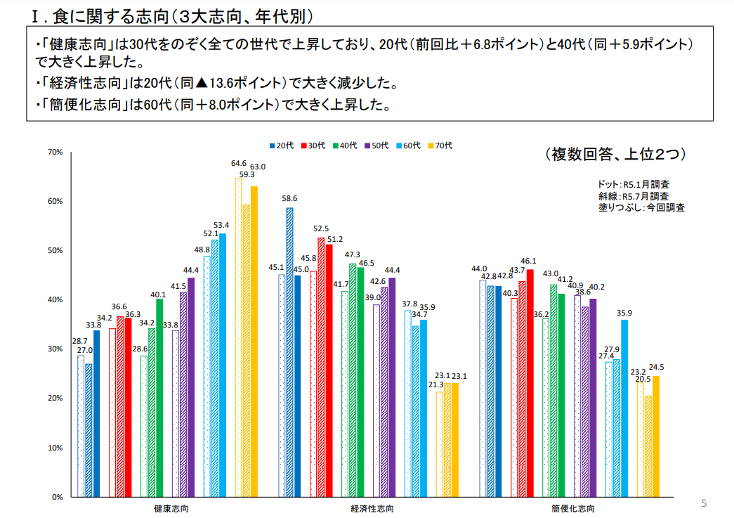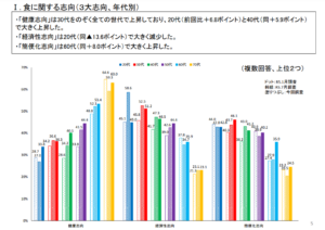 特に食事面において、たとえば多少高くても国産品の物を買うようにしているなど、昔よりも意識して健康に良い食品を選んで食べる様になったという人の割合は増加している傾向にあるようです。