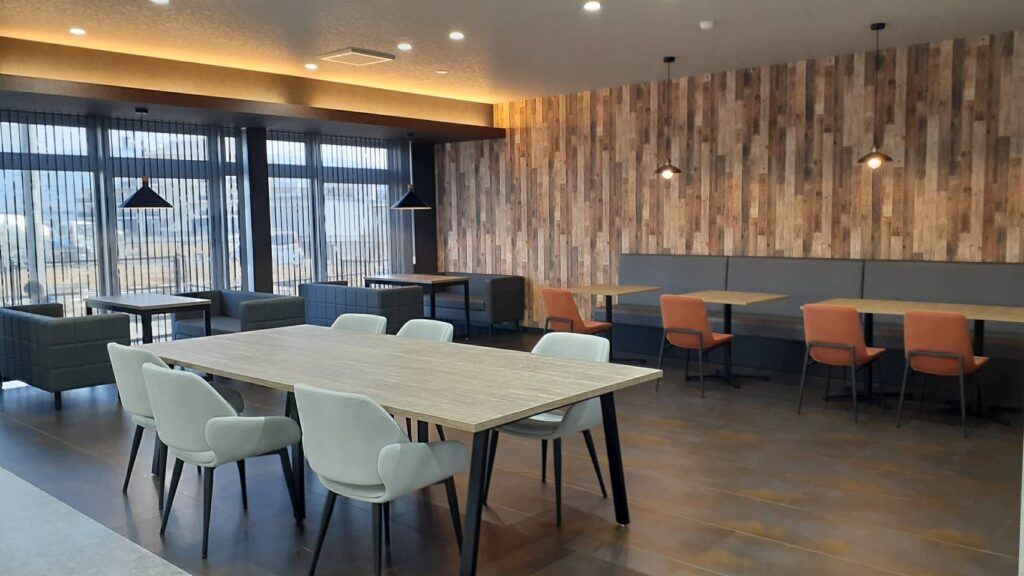 - インテリアのデザイン:社員食堂の内装は、おしゃれで居心地の良い空間を作ることが大切です。デザイン性の高い照明、椅子やテーブルなどの家具、そして調理場周辺のカウンターなど、細部にまでこだわったインテリアデザインを取り入れることで、食堂がより魅力的な場所になります。